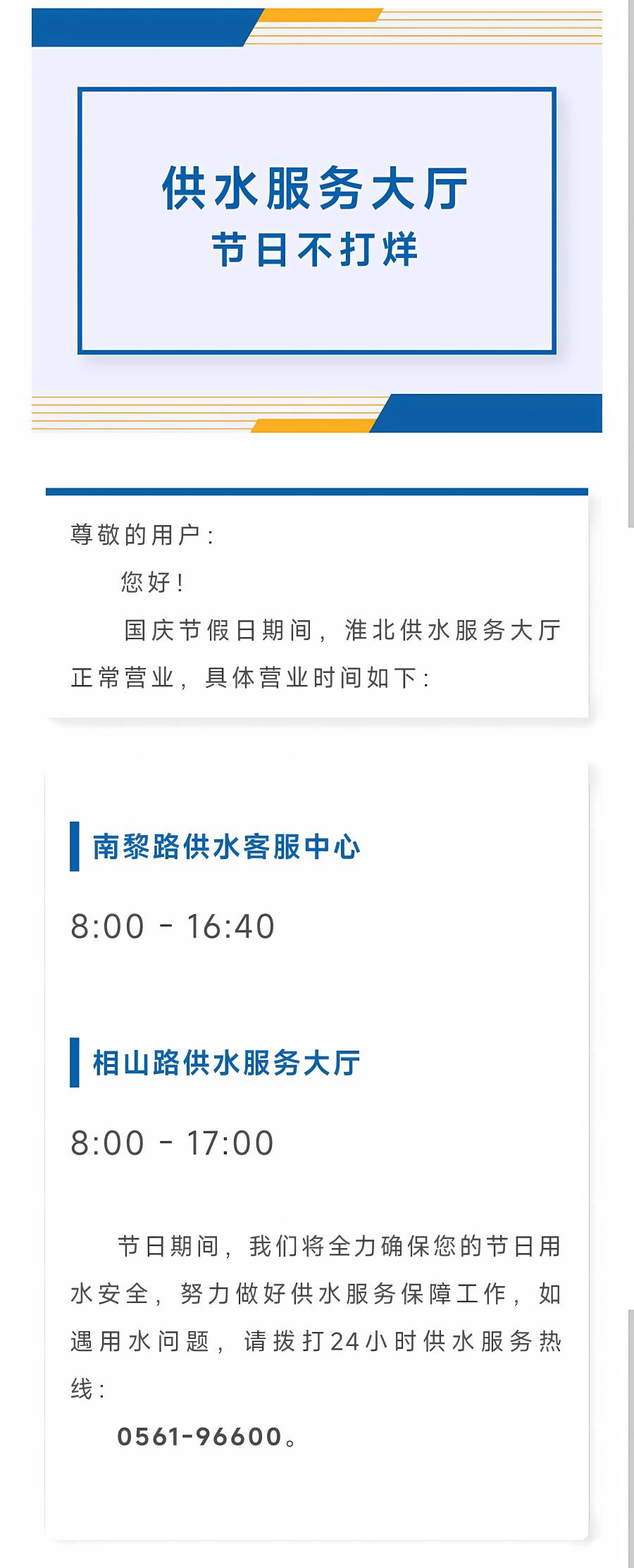 淮北市供水有限責任公司 地址:淮北市南黎路128號 郵編:235000 咨詢服務報修電話:0561-96600 (7x24小時服務) 監督投訴電話: 0561-3052780 行業主管監督投訴電話(市住建局): 0561-3022217 皖ICP備20012529號-1 皖公網安備 34060002030005號 技術支持:相王科技